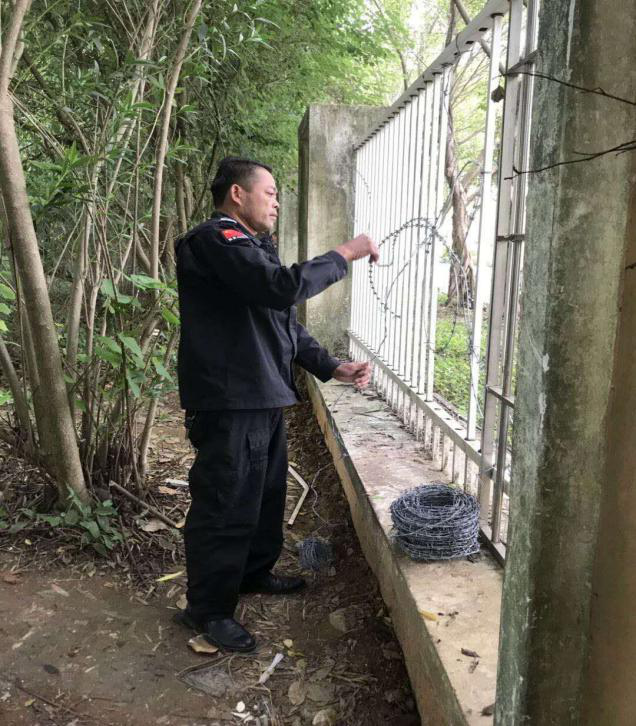常规安全隐患排查,发现校园东面围栏损坏。已安排保安人员临时维修,同时向后勤部报备加固处理。