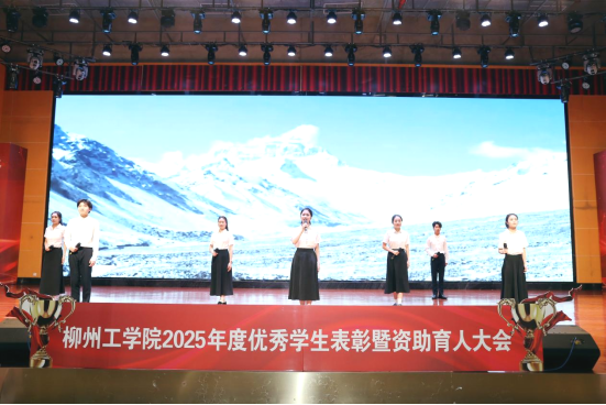 大会以“表彰先进树标杆,资助育人促成长”为主题,旨在表彰品学兼优的先进集体与个人,展示学校资助育人成果,激励全体学子奋发向上。伴随着校主持队深情演绎的朗诵《我在柳江河畔对祖国告白》,大会正式拉开帷幕。全体与会人员起立奏唱中华人民共和国国歌,庄严的旋律中凝聚着爱国情怀与青春使命。