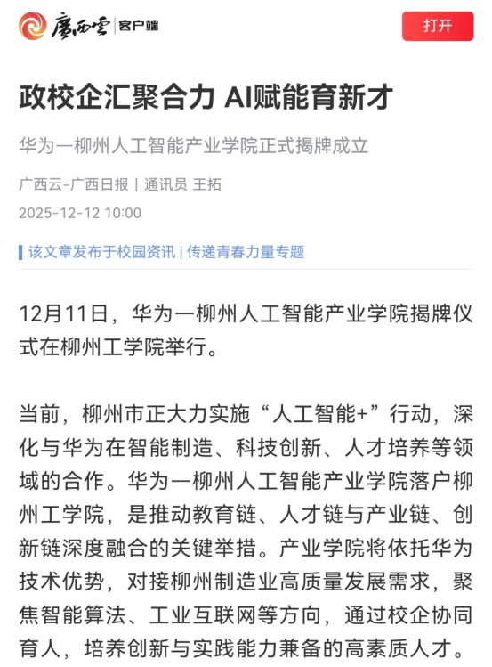 2.广西日报-广西云客户端:政校企汇聚合力AI赋能育新才华为-柳州人工智能产业学院正式揭牌成立