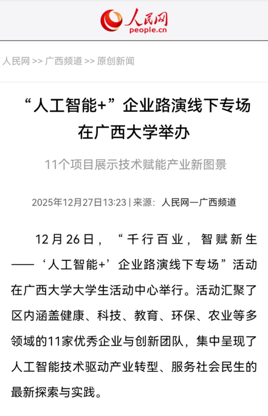 人民网:“人工智能+”企业路演线下专场在广西大学举办 11个项目展示技术赋能产业新图景