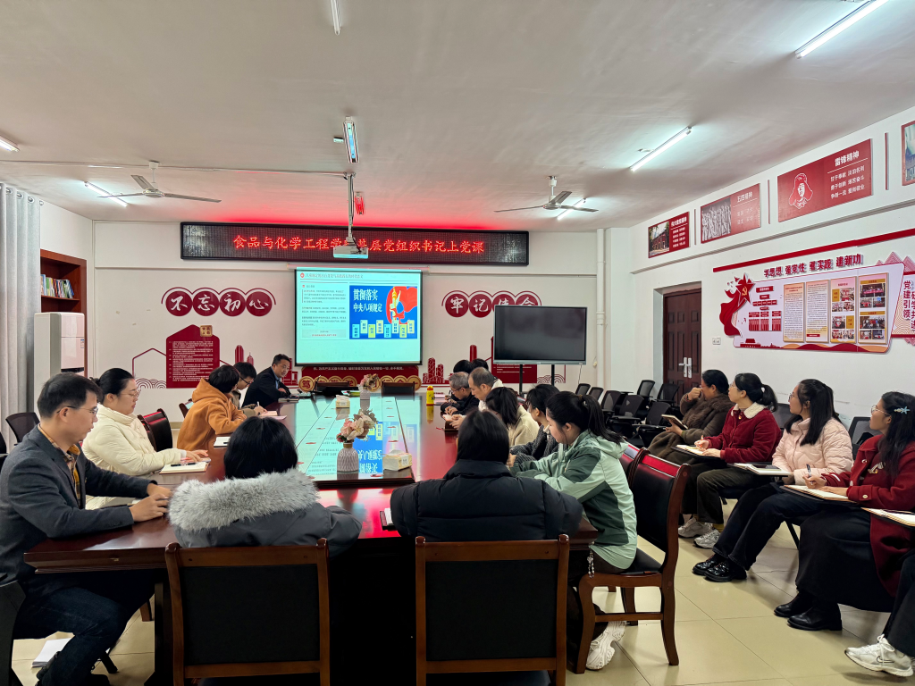 为深入贯彻落实中央八项规定精神,扎实推进作风建设,切实筑牢立德树人根基,12月24日,食品与化学工程学院教职工党支部组织开展“贯彻落实中央八项规定精神 涵养高校立德树人清风正气”主题党课。支部书记李玉同志带领全体党员围绕中央八项规定核心要义、高校贯彻落实重点任务及实践要求开展专题学习研讨。