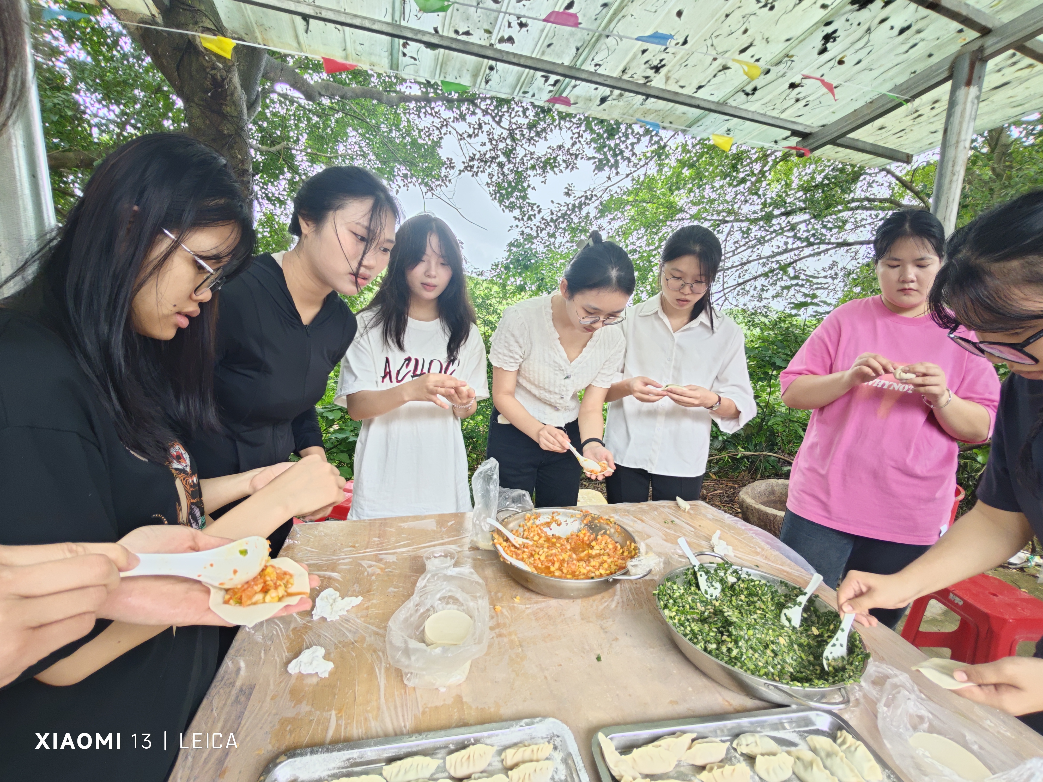 活动中,竹桐村园艺指导员讲解了本次活动的基本内容和注意事项,组织学生分两组开展劳动活动。其中一组体验农场园区劳动,包括种植红薯苗和中草药养护;另一组则学习民俗文化美食制作,具体环节有制作艾团、洋芋粉、磨豆浆和包饺子。