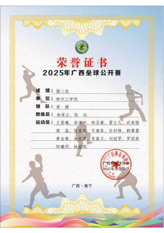 12月14日,由广西棒垒球协会主办,广西机电职业技术学院与柳州市棒垒球协会联合承办的2025年广西垒球公开赛圆满落幕。世俱杯棒球队经过多轮激烈角逐,最终凭借稳定的发挥荣获季军,为学校赢得了荣誉。