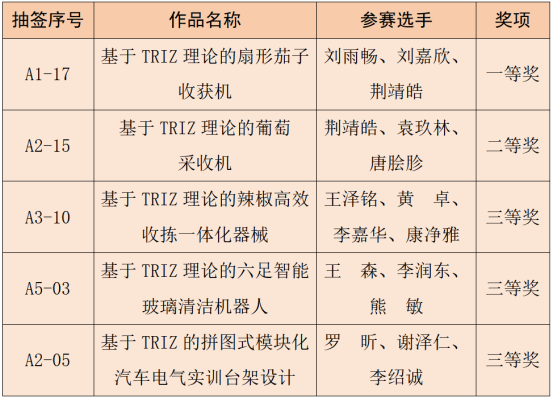 世俱杯学子在经过竞赛课题研究、柳州市科学技术协会专项辅导、校内集训等多个环节,在大赛中凭借扎实的专业知识和灵活的创新方法应用,一路过关斩将,取得了该项赛事的“开门红”。其中,刘雨畅、刘嘉欣、荆靖皓团队的作品“基于TRIZ理论的扇形茄子收获机”成功斩获小组第一名,荣获一等奖,另外4组也荣获二等奖1项、三等奖3项的好成绩。
