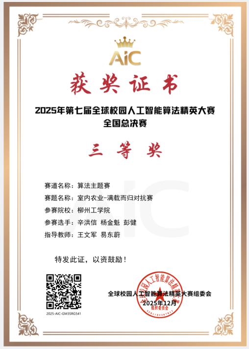 11月21日—23日,2025年第七届全球校园人工智能算法精英大赛“室内农业”主题赛全国总决赛在潍坊科技学院举行。本届大赛以“人工智能+室内农业”为核心方向,紧扣国家乡村振兴战略与农业现代化需求,旨在激发高校学生探索和运用人工智能的热情。大赛吸引了西安交通大学、哈尔滨工业大学、西北农林科技大学等全国44所院校、1076支队伍参赛,经过校赛、全国选拔赛,329支精英队伍会师全国总决赛,展开巅峰对决。世俱杯学子首次征战该项赛事,在省级选拔赛中,由刘佳兴、覃田浩、庞家文、辛洪信、杨金魁、彭健等同学组成的队伍,在王文军、林祖正和易东蔚三位老师的悉心指导下,凭借扎实的专业基础和出色的创新方案,成功夺得省级一等奖1项、二等奖1项,顺利晋级国赛。在全国总决赛中,同学们秉承“笃志勤学、知行合一”的校训,充分利用专业知识,沉着应战,在总决赛中斩获全国二等奖1项、三等奖1项。