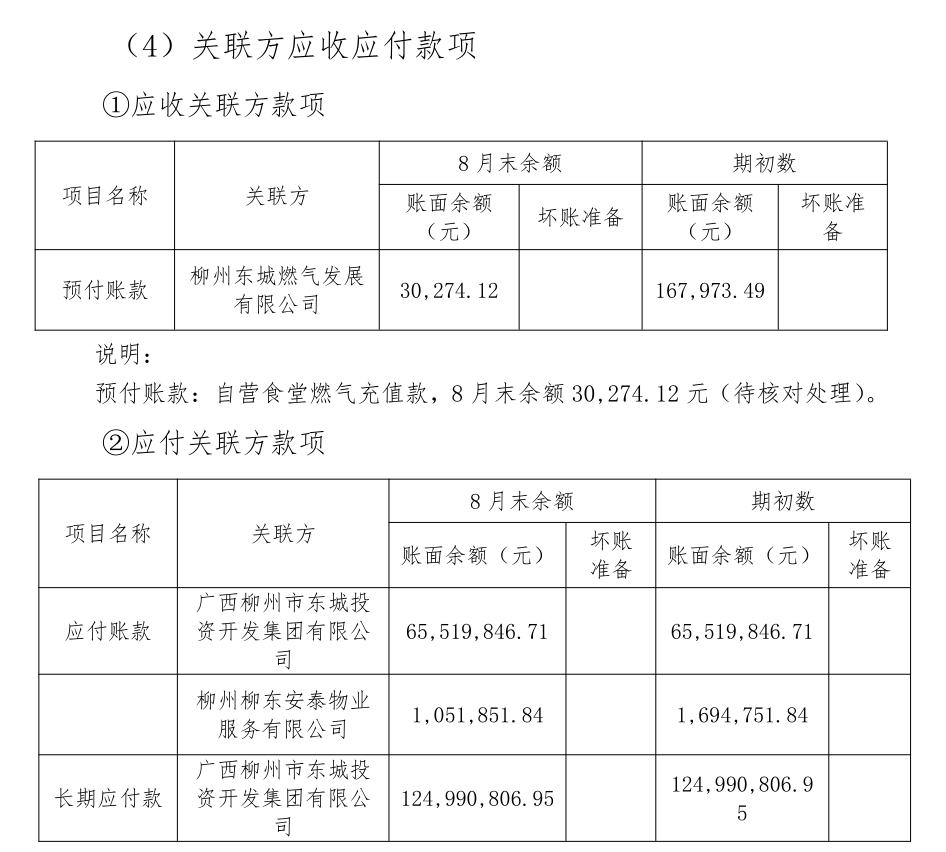 1.应付账款:返还东城集团派出人员工资、北校区项目完工按合同金额暂估转入固定资产和J栋宿舍及主楼外立面暂估转入固定资产后工程款挂账,截至8月末账面余额 65,519,846.71元。