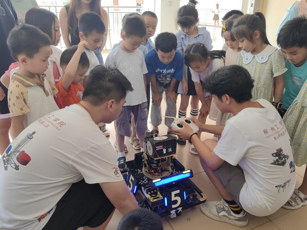 活动开始,由鹿人甲机器人队的志愿者给小朋友们讲解科技的重要性、科技与生活的点点滴滴、我们身边的科技产物等方面知识,并带领小朋友们在操作中探索机器人的奥秘,让小朋友们近距离感受机器人,在他们心中种下科技启蒙的种子,激发他们的学习兴趣。