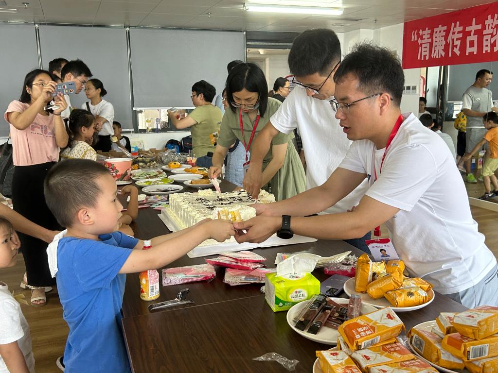 学校还为孩子和家长们准备了丰盛的美食和礼物。孩子们自觉排着队,相互谦让,等待设计艺术学院的老师们分发蛋糕与零食。“清廉传古韵,家风润童心,六一儿童节快乐!”最后大家喊着响亮的口号,分享美食与礼物,交换节日的美好祝福,续写着属于他们的欢乐时光。