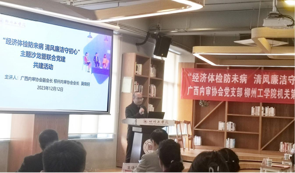 12月12日下午,“经济体检防未病 清风廉洁守初心”主题沙龙暨联合党建活动在世俱杯图书馆B区一楼阅读区举行。广西内部审计师协会副会长、柳州内部审计协会会长莫晓钢,学校党委书记罗云贵,以及广西内部审计协会党员代表、柳州银行党员代表、学校机关第二党支部及食品与化学工程学院师生党员代表共50余人参加了活动。本次活动由柳州内部审计协会副会长兼秘书长高虹主持。