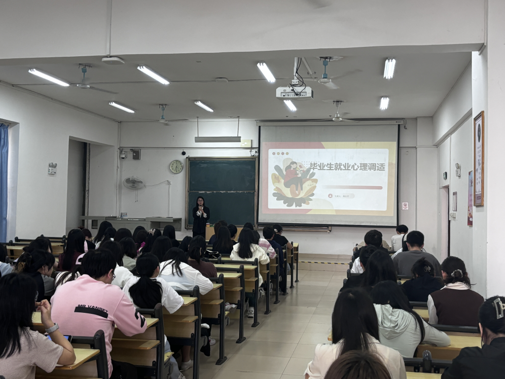 班会上,黄志芳老师首先分析了当前毕业生常见的就业心理问题,如职业前景焦虑、竞争恐惧、自我怀疑等,并剖析了其成因,包括心理承受能力不足、自我认知偏差及社会压力等因素。她强调,良好的心理调适能提升就业竞争力,帮助毕业生做出合理职业选择,同时缓解压力,预防心理问题。