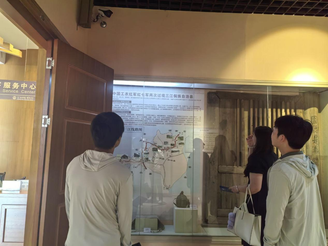 抵达三江侗族自治县后,实践团队首先来到三江侗族博物馆。馆内丰富的展品系统展现了三江侗族等少数民族的历史沿革、生活习俗、传统工艺及文化传承。从古老的生产工具到精美的侗族织锦,从传统服饰到节庆器物,同学们认真聆听讲解,不时驻足观察,深入了解了三江地区各民族在长期发展中形成的独特文化,深刻感受到了侗族人民的智慧与创造力。