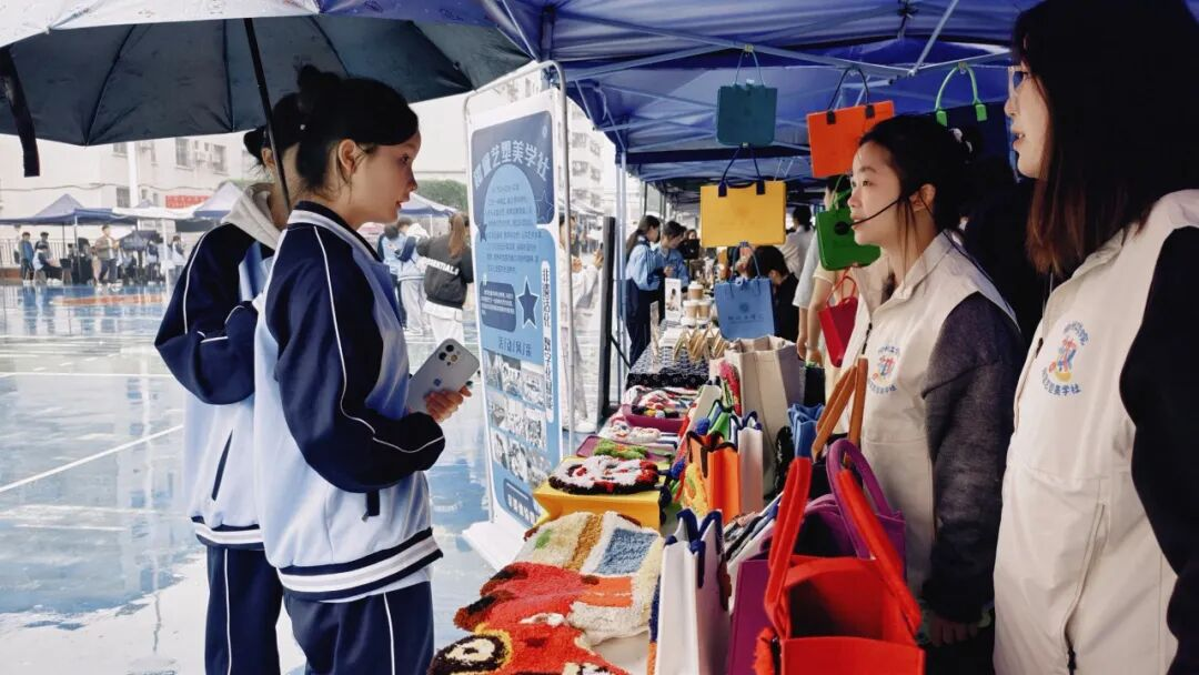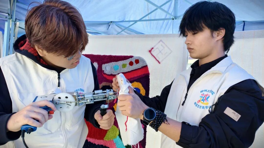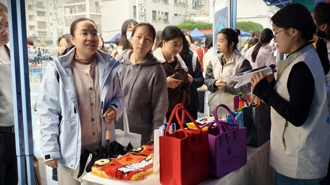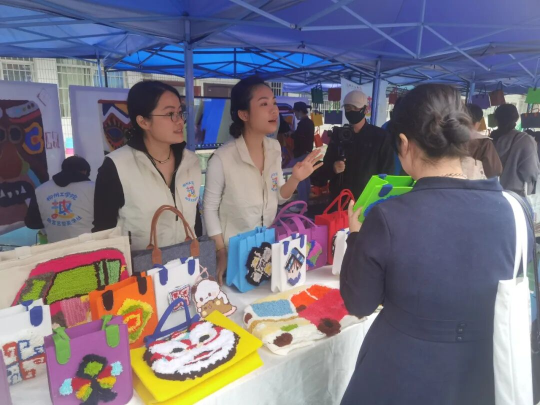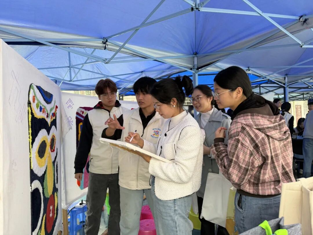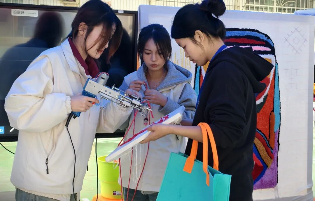 展示现场,社团成员着装整齐、举止文明,化身“非遗文化讲解员”,向参会嘉宾细致介绍“设计-培训-生产”的助农闭环模式,讲解苗族纹样与簇绒工艺的创新融合思路。不少嘉宾驻足体验簇绒基础技艺,在动手实践中感受非遗魅力与德育温度,对社团以专业所长助力文化传承、服务乡村振兴的举措给予高度评价。