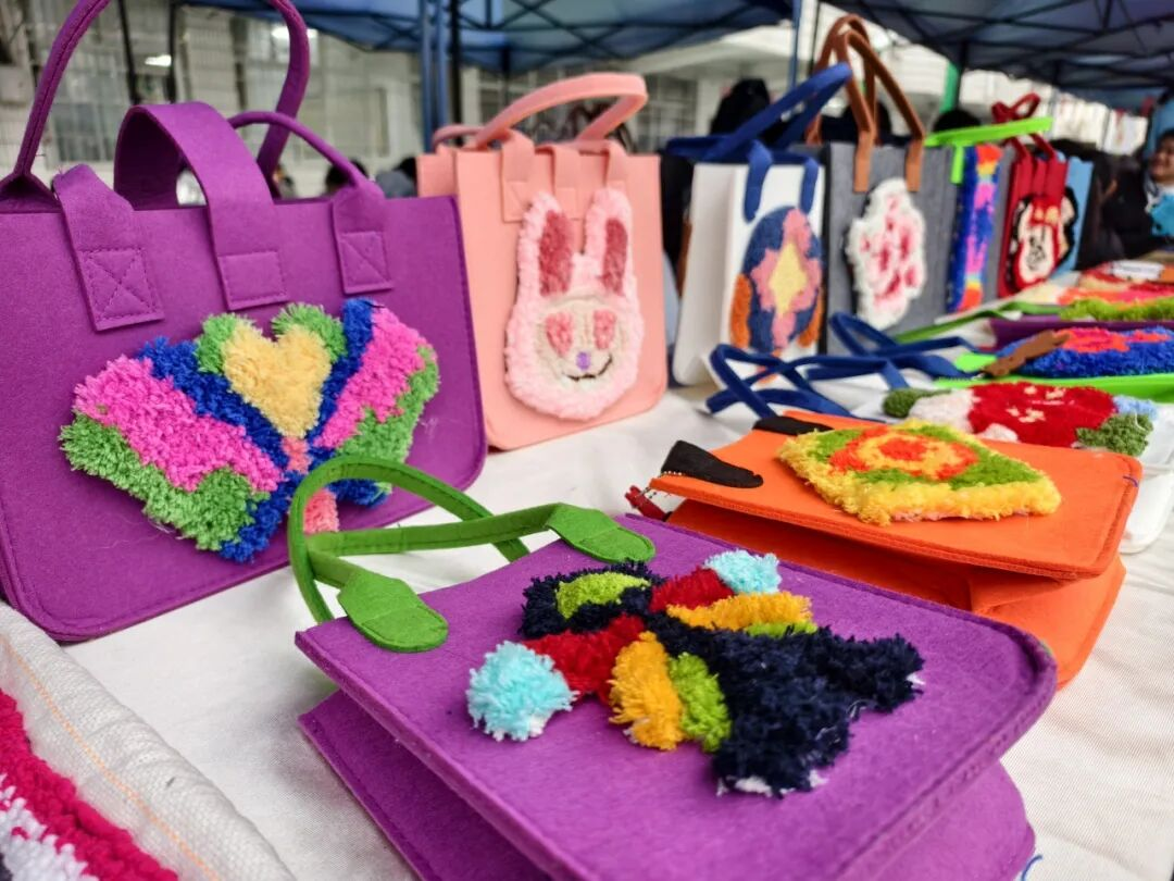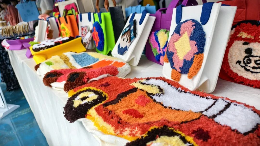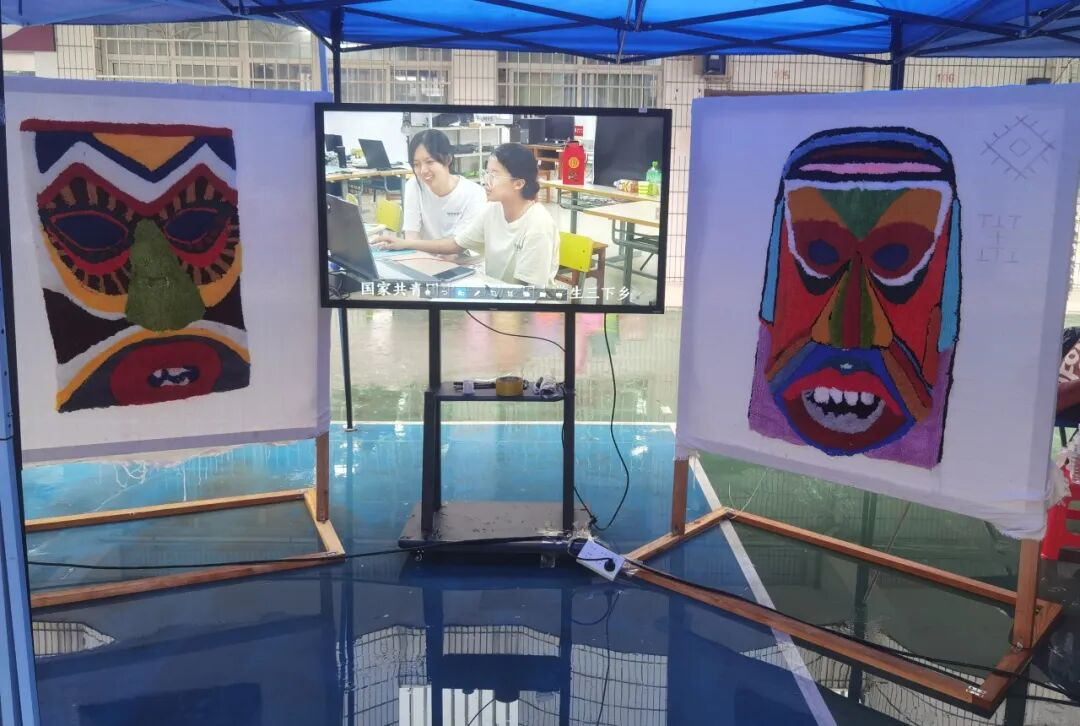 作为集专业特色、科技与非遗技艺于一体的艺术社团,趣置艺塑美学社此次以2025年“三下乡”社会实践成果为核心展项,集中呈现团队在广西融水苗族自治县的艺术赋能实践。展览环节,以“非遗活化+数字化赋能”为核心的簇绒作品格外引人注目:四件与融水苗族自治县绣娘群体、非遗传承人联合创作的大型簇绒艺术装置,将苗族文化符号通过丰富色彩与立体肌理进行现代表达;毛毡包、装饰画、杯垫等由暑期受训妇女独立完成的簇绒文创产品,则生动展现了传统技艺的当代活力。