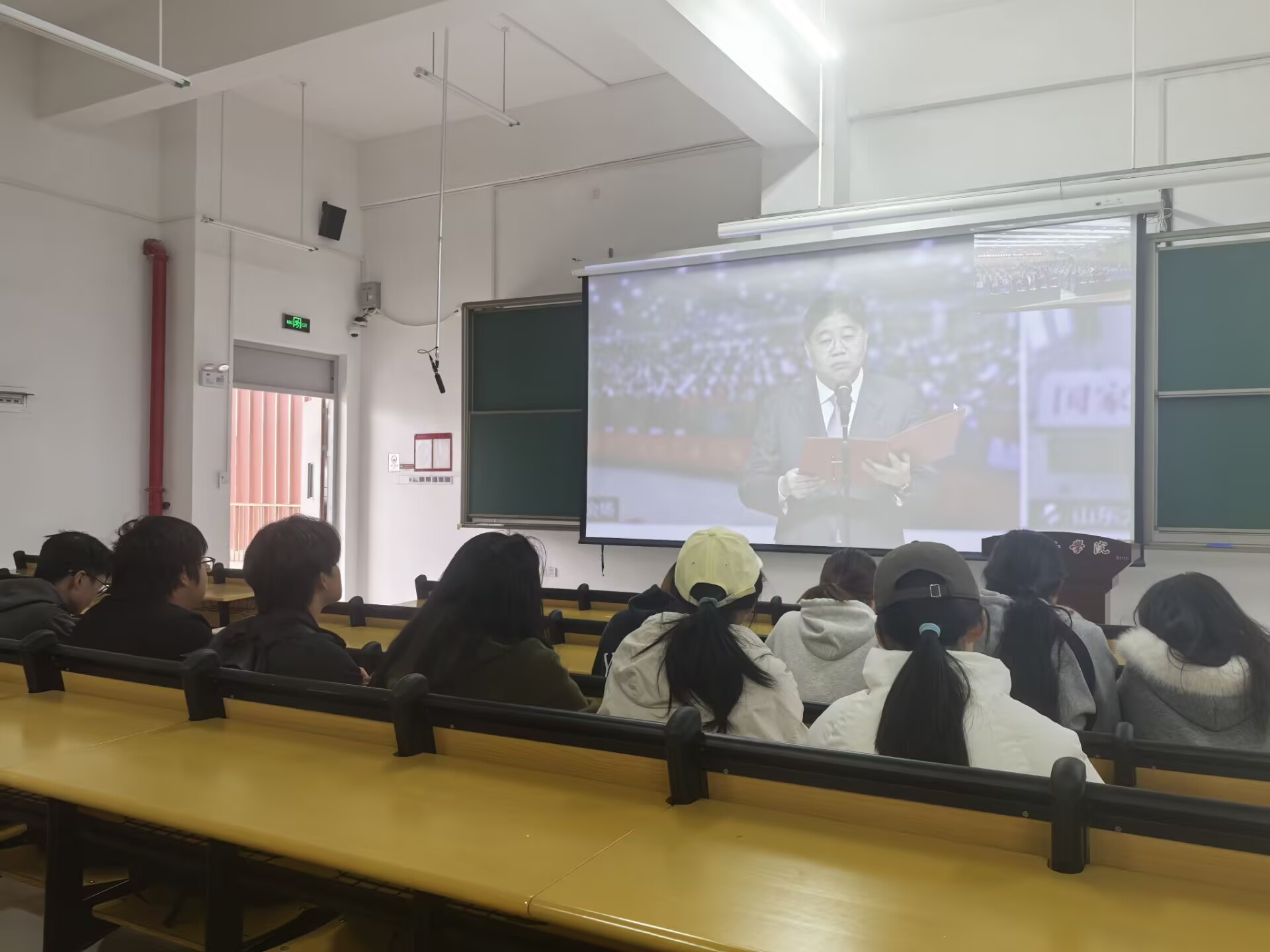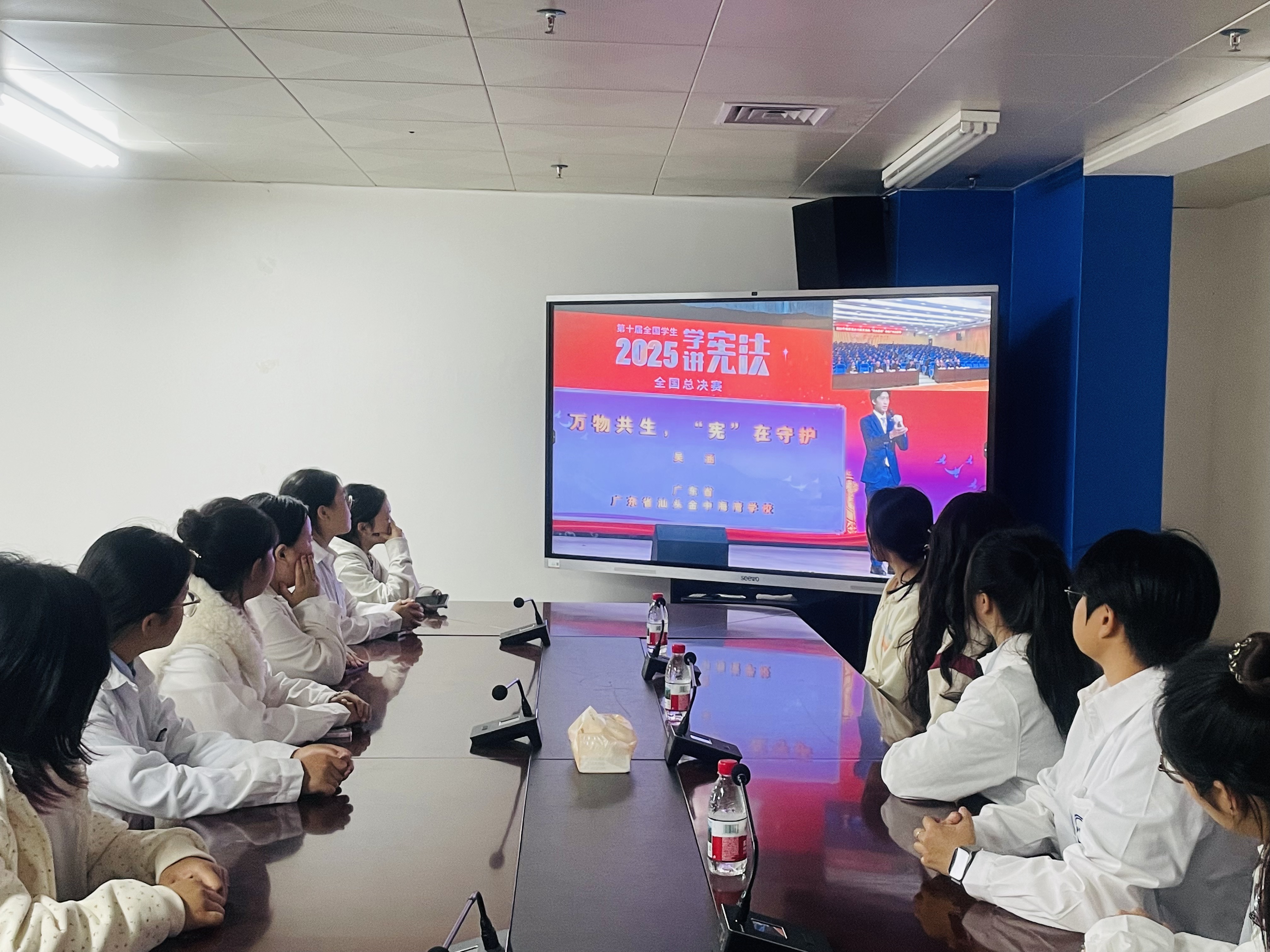 直播过程中,当庄严的国歌声从屏幕中传出,全体学子自觉起立、肃立致敬,目光坚定而专注;在教育部负责同志的领读下,大家齐声诵读宪法核心条款,“中华人民共和国的一切权力属于人民”“国家尊重和保障人权”等铿锵有力的字句跨越网络空间,在校园各处回荡,让青年学子在沉浸式参与中感受宪法作为国家根本大法的威严与温度。合唱环节,学子们跟随旋律共同唱响《宪法伴我们成长》,用青春之声传递对宪法的尊崇与信仰;在优秀作品展演环节,全国总决赛获奖选手的精彩表现,更让大家深刻体会到宪法与青年成长、社会发展的紧密联系。