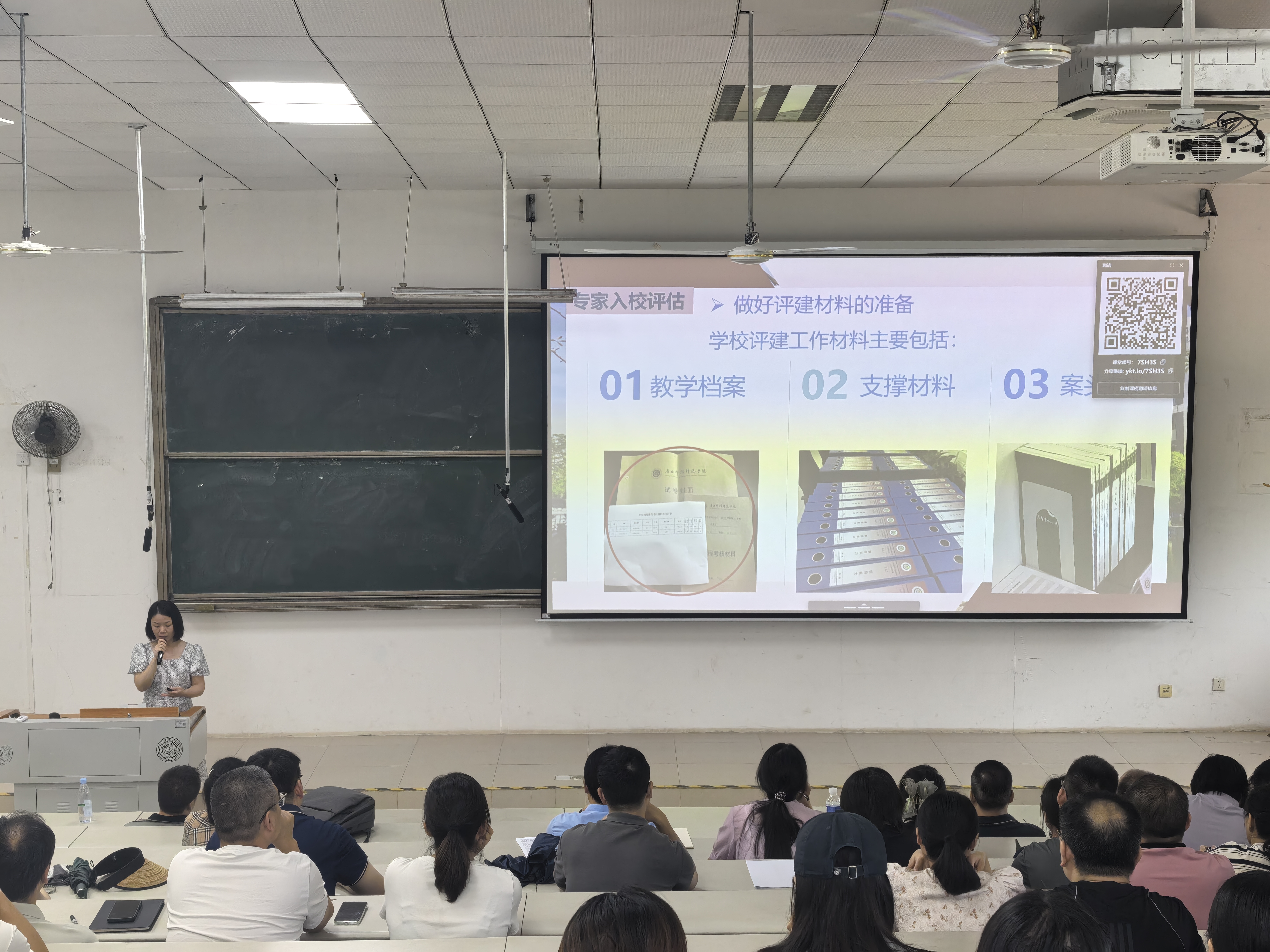 教务处副处长韦冬萍围绕课程考核材料存档规范展开培训。她结合本科教学工作合格评估要求,详细解读了考试命题、试卷评阅、过程性考核、成绩录入、试卷分析及材料归档的全流程规范,强调试卷存档必须做到统一模板、统一格式、统一装订、统一上架,并针对普遍问题提出了整改建议。