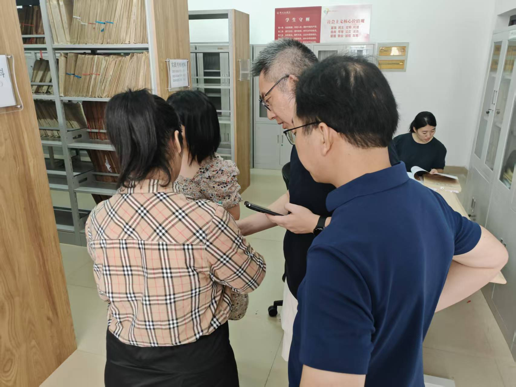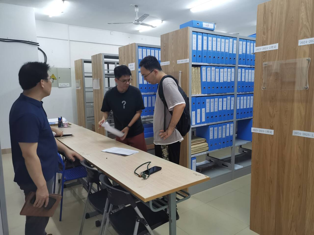 本次检查由教务处牵头实施,覆盖全校各教学单位,采用“即到即查”的方式深入各单位档案室进行实地查验。通过查阅档案材料、现场随机抽查、听取即时汇报等方式,检查组对试卷、毕业论文(设计)归档的时效性、规范性,以及磨课活动的进展实效进行了详细核查。各教学单位迎检人员全程在场,随时准备解答检查组的问题,并提供必要的支持。