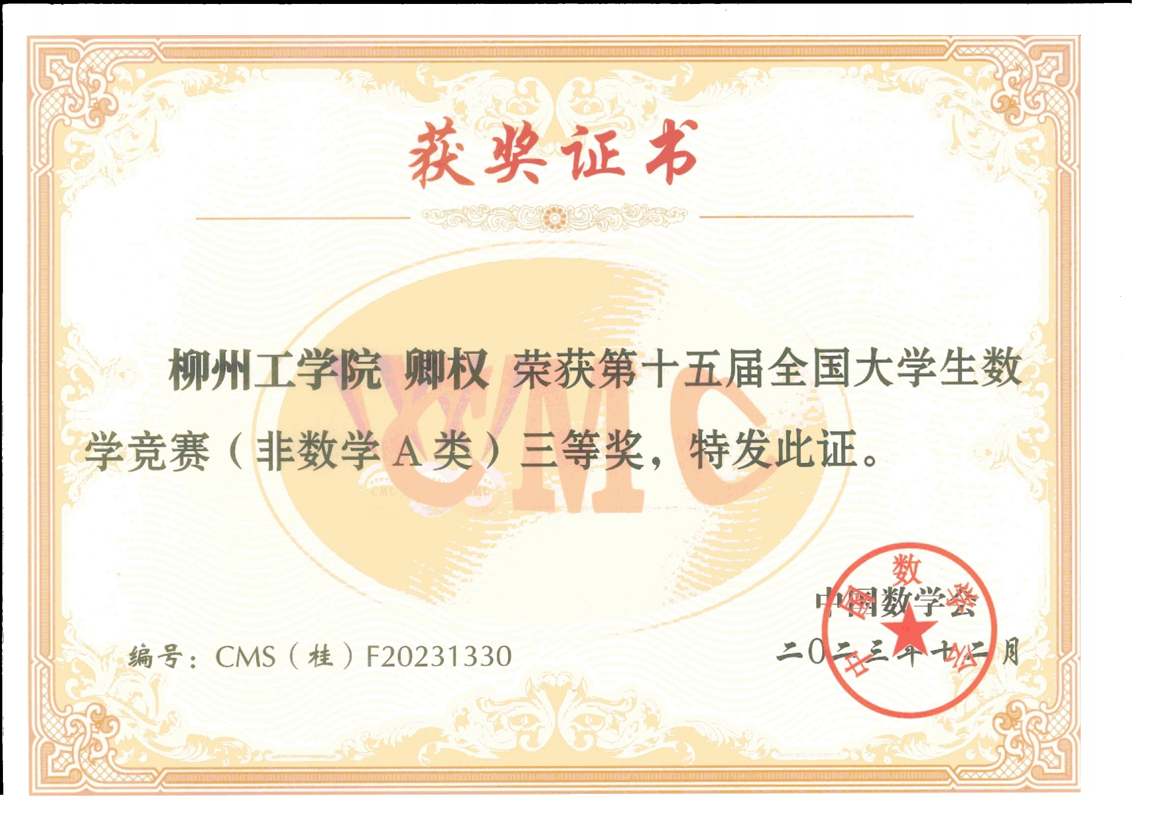 2023年度获得第15届全国大学生数学竞赛三等奖